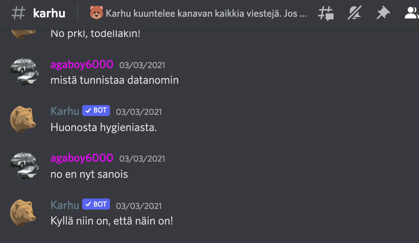 Tekstikanavalla ollessa mainitse Karhun nimi tai pingaa karhu, kun kysyt siltä. Voit myös nimetä tekstikanavan sisältämään sanan karhu, jolloin botin nimeä ei tarvitse mainita.