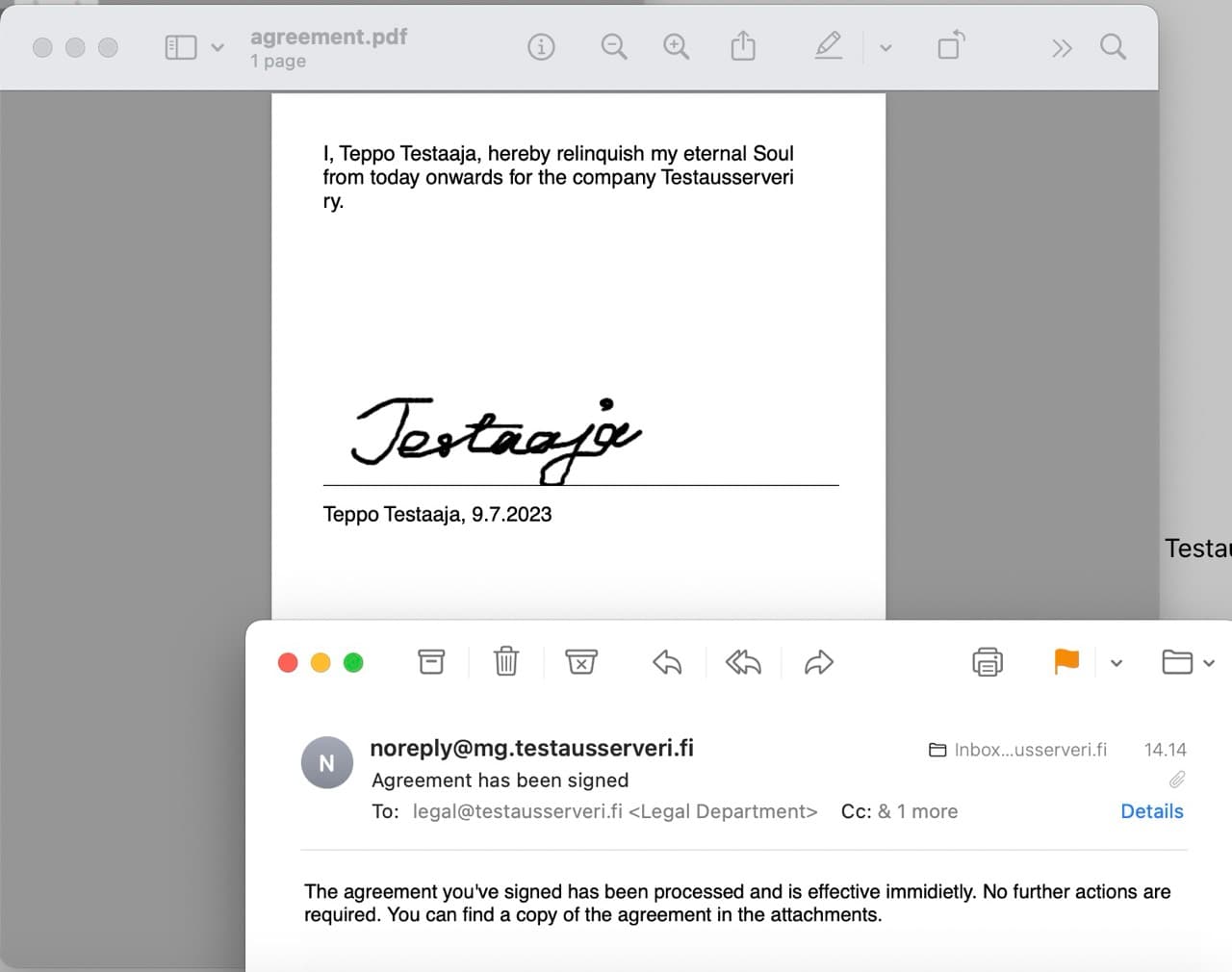 Lisäksi kävijän sähköpostiosoitteeseen lähetään allekirjoitettu kopio sopimuksesta PDF-muodossa, lähettäjänä Testausserverin lakitiimi.