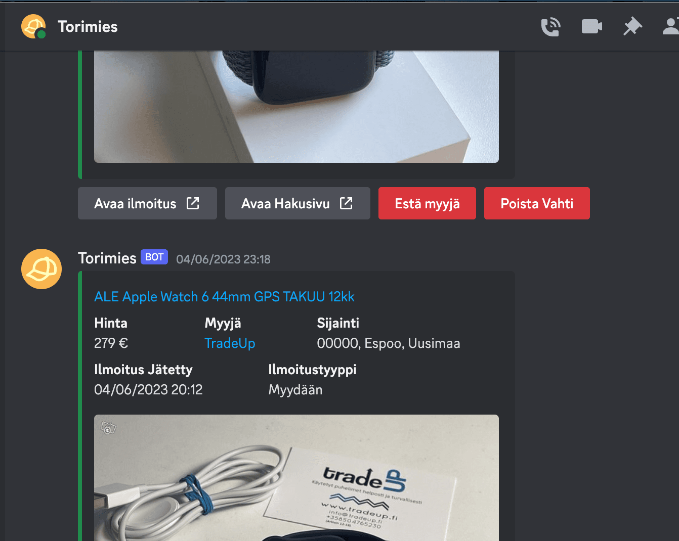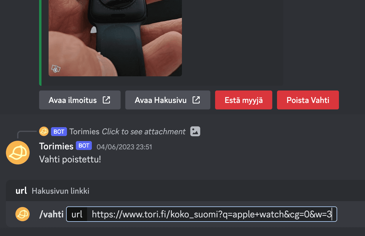 Botti alkaa seuraamaan hakusivua ja ilmoittamaan sinulle yksityisviestitse uusista ilmoituksista. Viestissä on painikkeet, joilla voit halutessasi lopettaa hakusivun seuraamisen (poista vahti) tai estää häiritsevän ilmoittajan.