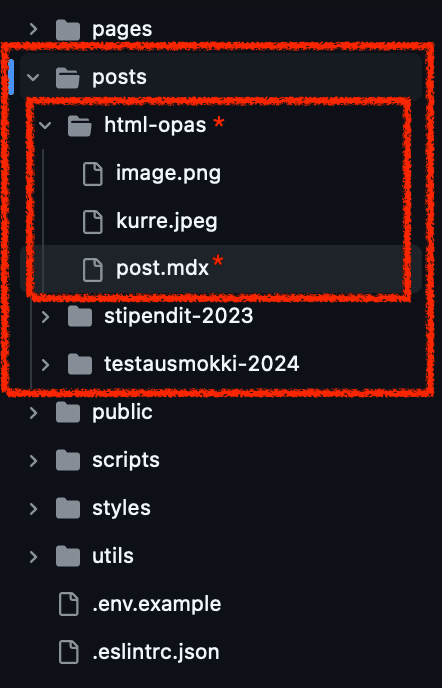 Tämä mdx-tiedosto määrittelee postauksen perustiedot ja itse sisällön. Kansioon voi laittaa muita mediatiedostoja mukaan, joita haluaa sisällyttää postaukseen. Haluat kuitenkin postaukselle vähintään yhden kuvan sen pääkuvaksi.